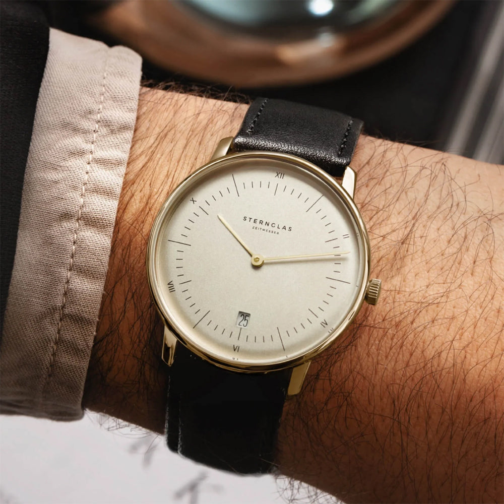 The Sternglas NAOS Edition Vintage S01-NAV14-MO03 is a timeless classic, featuring a sepia-satined gold-tone stainless steel case and a minimalist Bauhaus-inspired design. The sleek black Modena leather strap complements the elegant 38mm case, making it a sophisticated timepiece for both casual and formal wear.