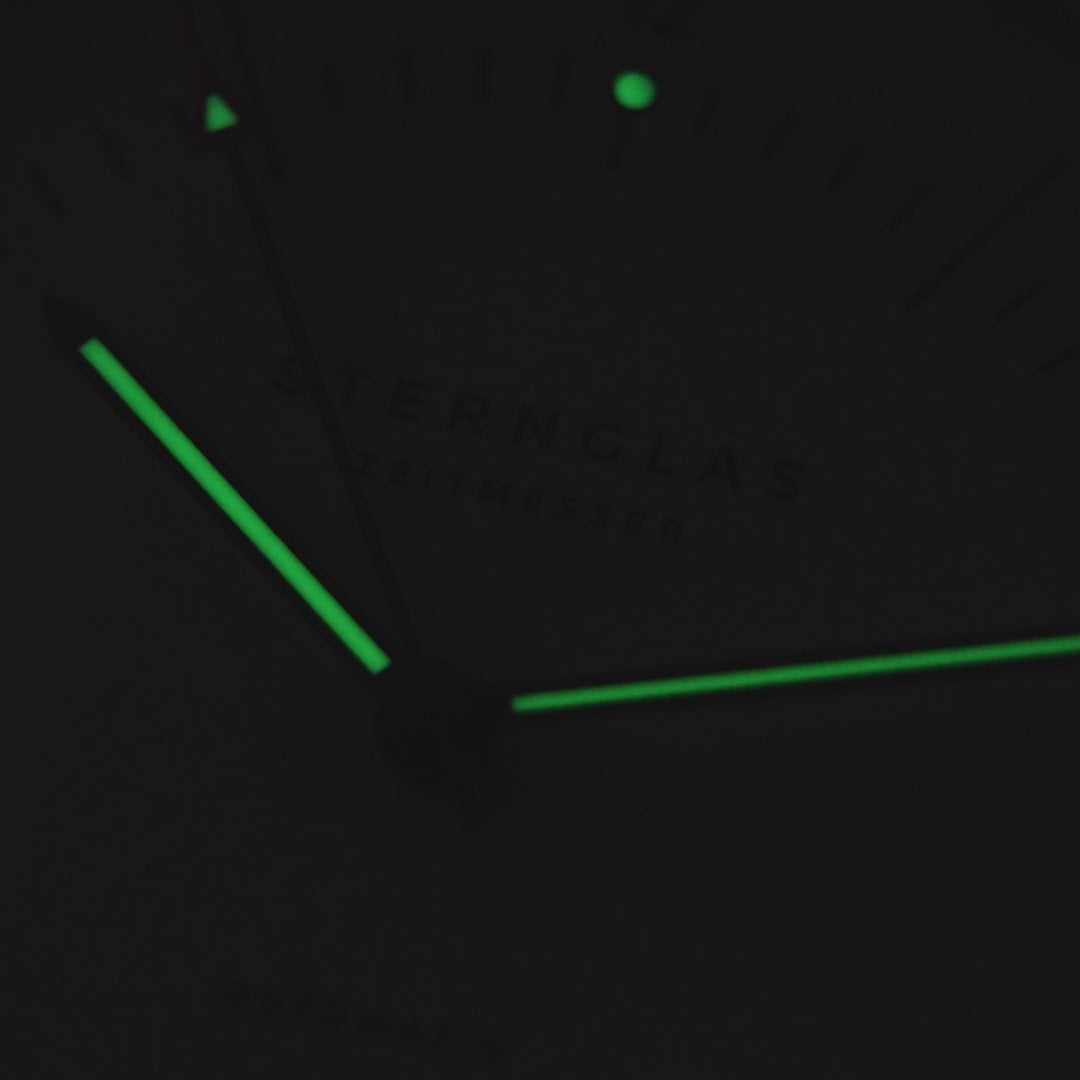 The Sternglas Naos Automatic Bronze blends vintage warmth with modern precision. Its brushed bronze PVD case naturally develops a patina over time, framing a satin-finished alabaster dial with luminous hands for enhanced readability. A domed sapphire crystal with double anti-reflective coating ensures durability and clarity, while a transparent case back reveals the automatic movement.