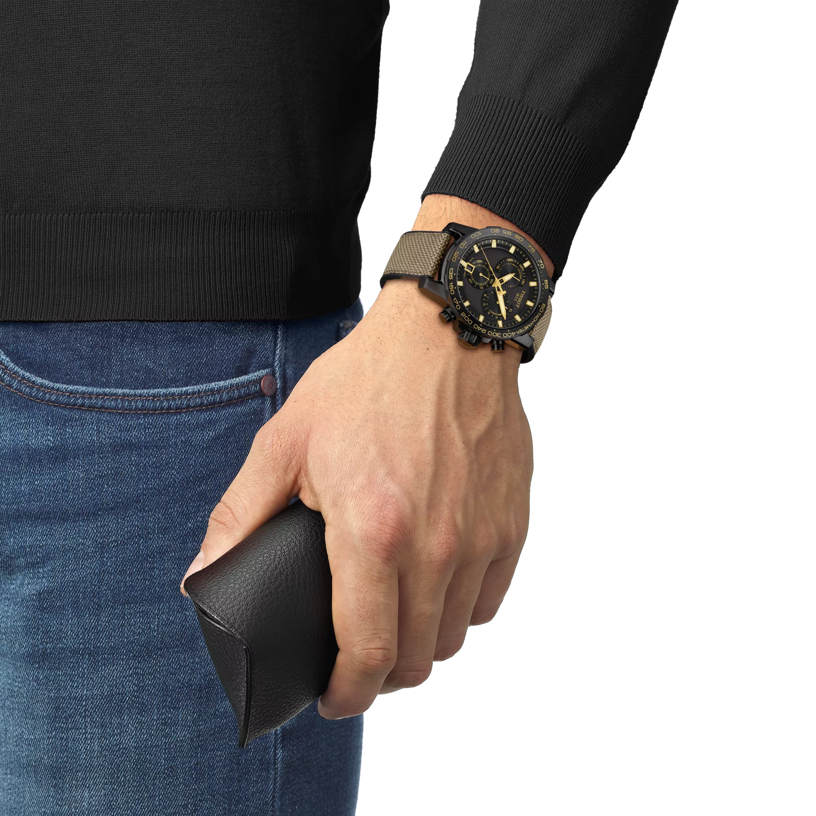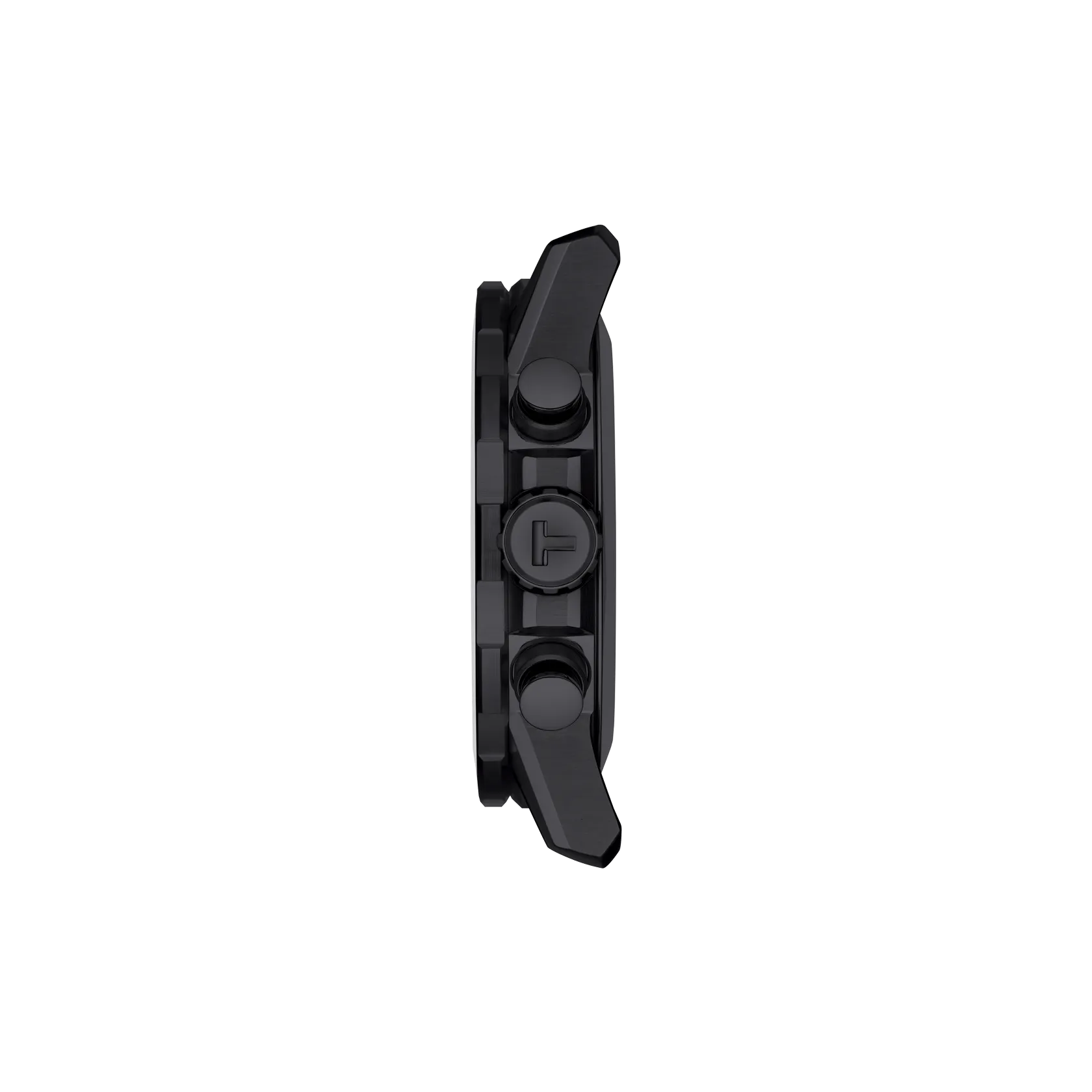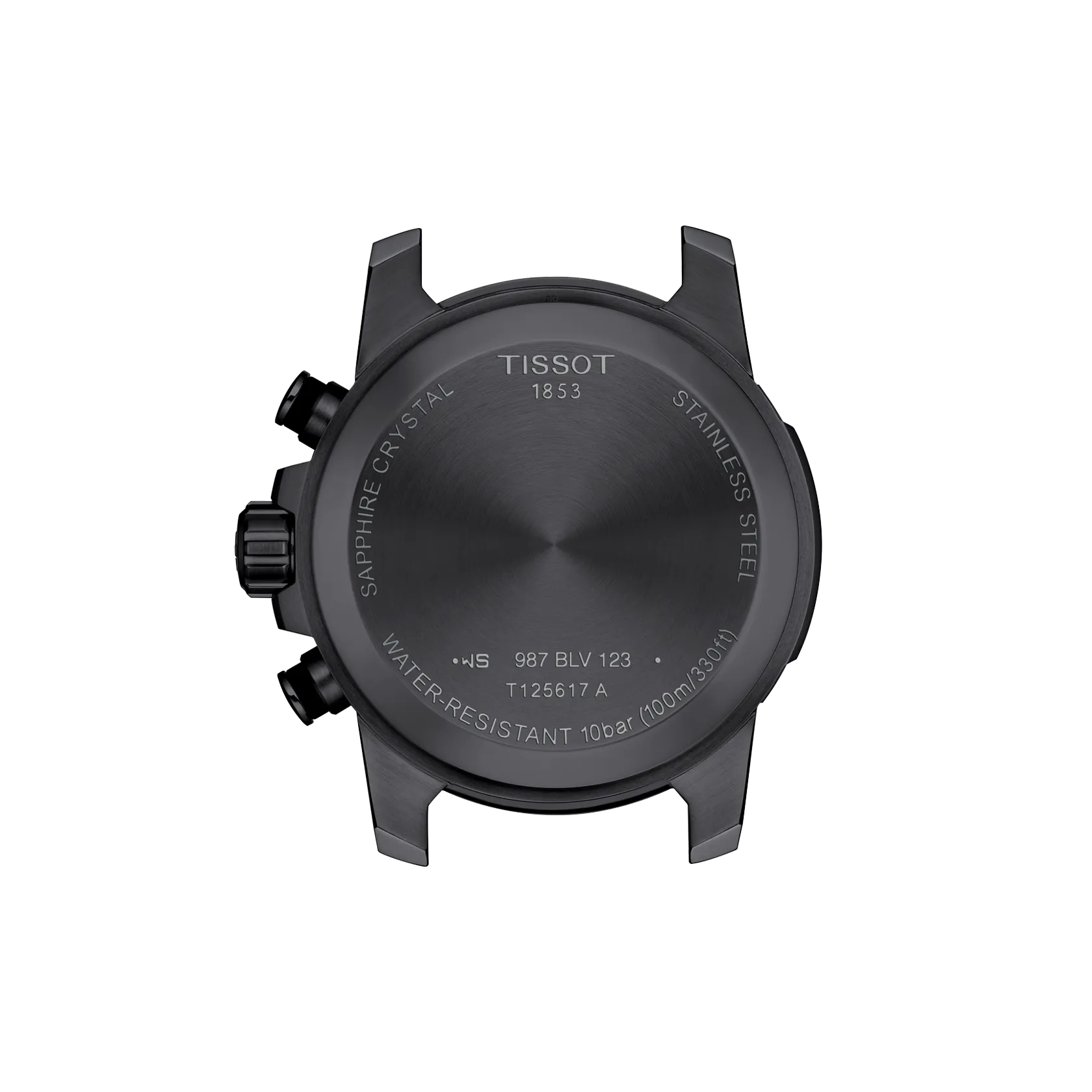 The Tissot Supersport Chrono T125.617.37.051.01 brings bold modern sportiness to the forefront with its large 45.5 mm profile and strong visual presence. Its black PVD-coated stainless steel case paired with an aluminium bezel ring adds depth and durability, while the black dial enhances readability through Super-LumiNova® accents. Powered by a Swiss quartz chronograph movement with an End-of-Life indicator, it ensures dependable precision and straightforward functionality for everyday timing needs. The grained cowhide strap delivers comfort and a rugged aesthetic, supported by an interchangeable quick-release system for added versatility. With 10-bar water resistance and a confident design language, the Supersport Chrono blends performance and style into a compelling sports watch.